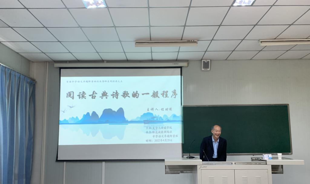 劳动节前夕,按照“中学语文卓越师资班”人才培养计划方案,4月29日下午4点,koko官网特邀安康市汉滨高级中学副校长、特级教师、陕西省名师培养对象实践导师程时进老师在1018教室开展了题为“阅读古典诗歌的一般程序”的专题讲座活动,活动由中学语文卓越师资班班主任张格瑄老师主持。