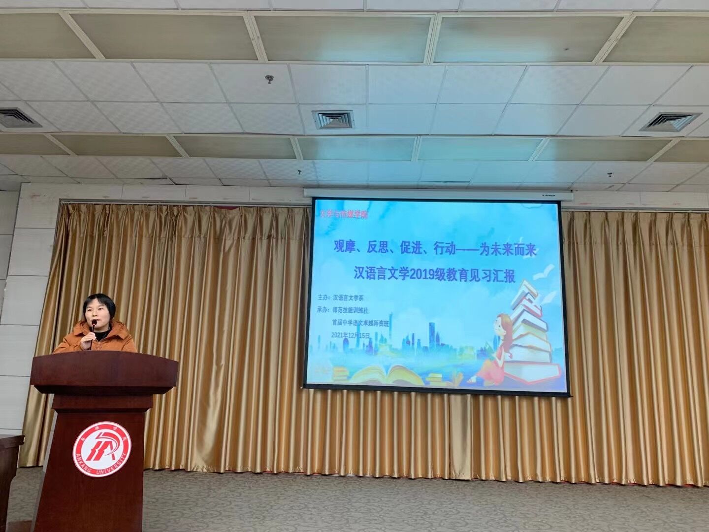 李婷首先为见习汇报致辞。2019级四个班的小组代表依次上台汇报。“习诵读教法,建活力课堂”、“教蕴言行中,学绽谈笑间”“兴趣是最好的老师”“体育与语文的碰撞”“登山知山高,临溪晓地厚——文化氛围与教学借鉴”“行是知之始,知是行之成”,一组组带有深刻反思的见习汇报用轻松幽默且耐人寻味的方式展演出来,台下阵阵掌声就是见习活动圆满成功的最好诠释。