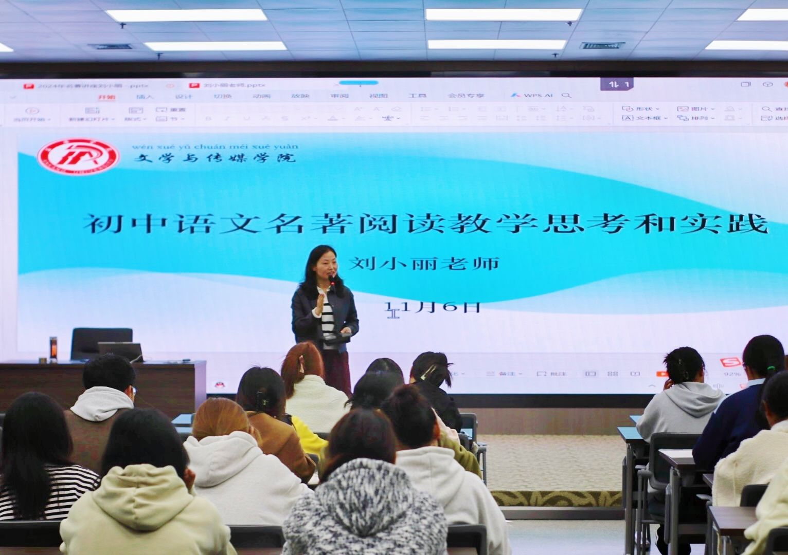 2024年11月6日,koko体育官网第四届“中学语文卓越师资班”第二场学术活动成功举行,本次讲座特邀陕西省语文教学名师刘小丽开展了以“初中语文名著阅读教学思考和实践”的专题讲座活动,班主任唐明珍和师资班全体学生聆听了本场讲座。